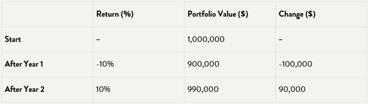 For example, a 10% decline followed by a 10% gain does not restore the portfolio to its starting value. The recovery is incomplete because the gain is applied to a smaller base.