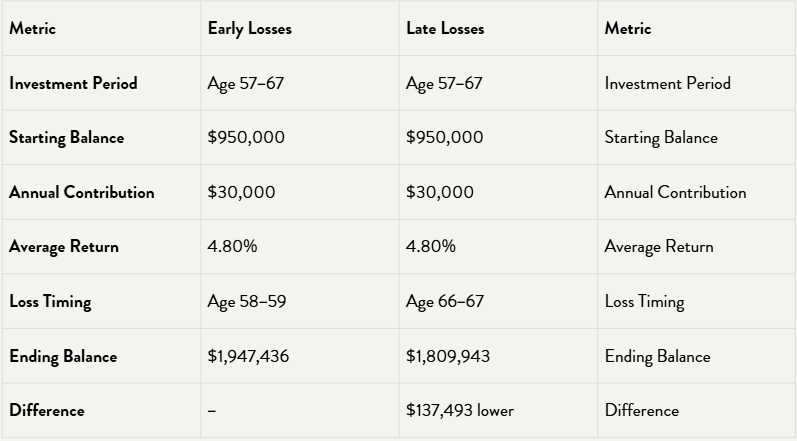 The outcome diverges. The portfolio experiencing early losses reaches an ending value of approximately $1.95 million. The portfolio where losses occur later finishes at approximately $1.81 million. The difference is approximately $137,000.
